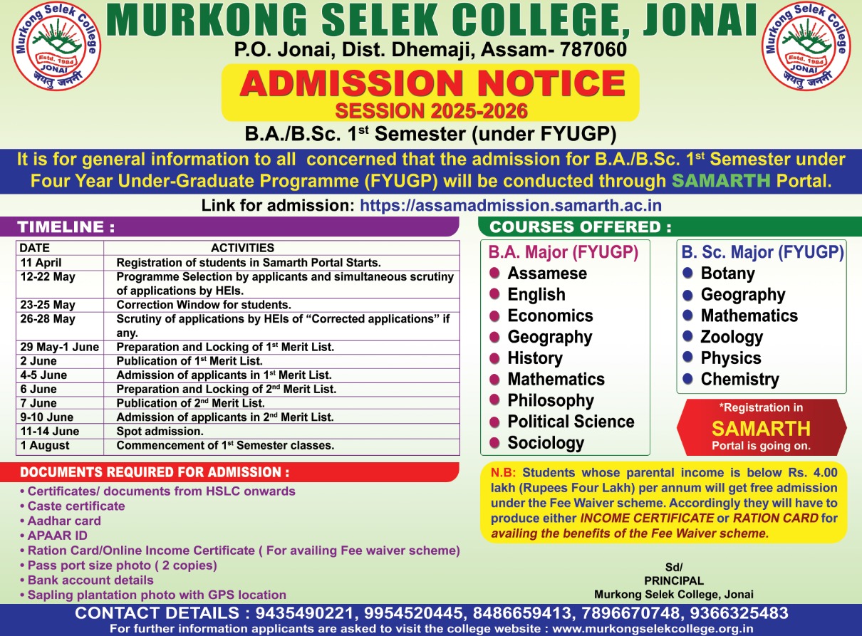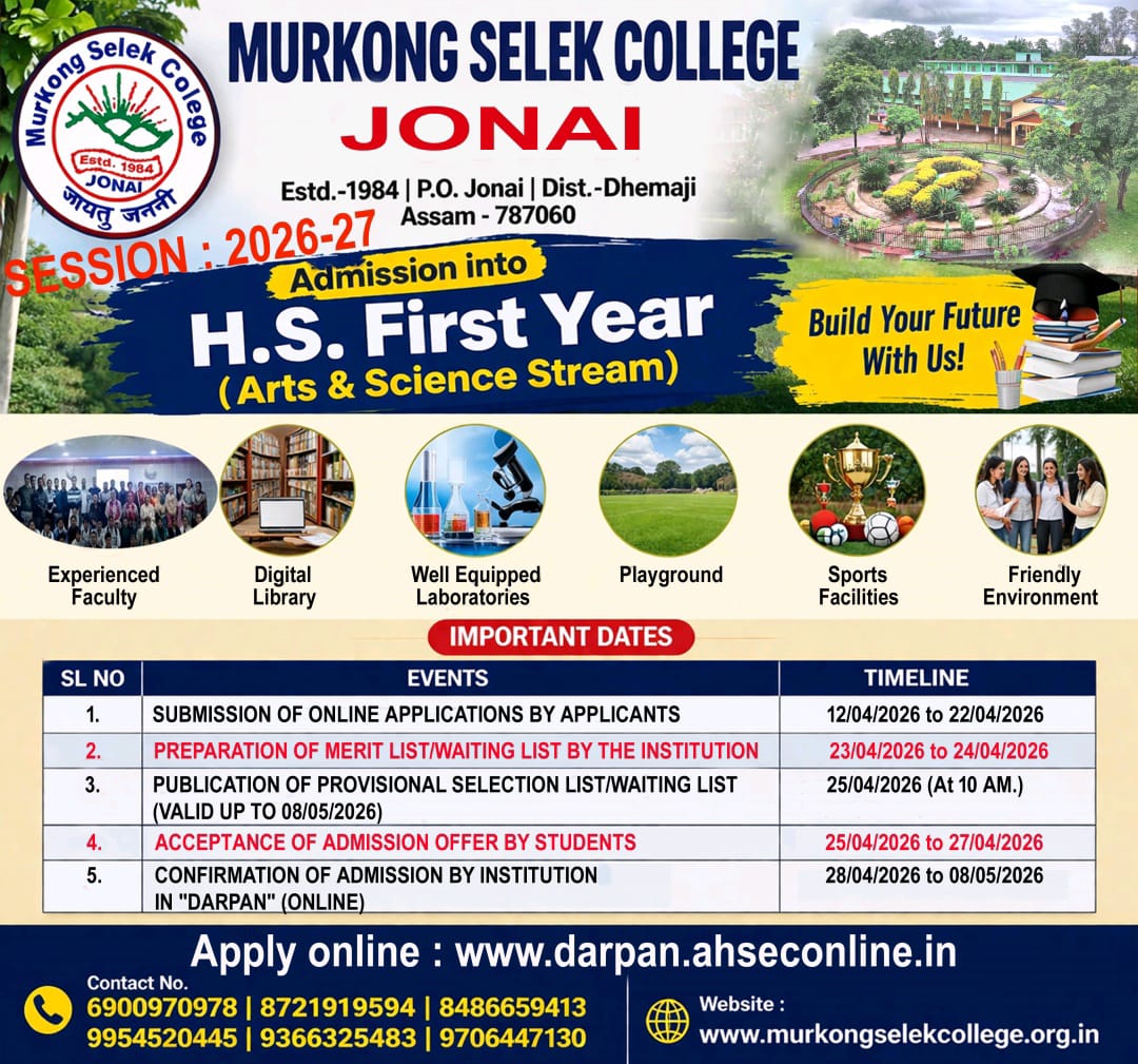 Murkong Selek College, the premier educational institution of Jonai Sub- Division was established in the year 1984, with the cherished goal of spreading broader knowledge among the aspiring students of this sub-division and beyond. Murkong Selek College is the outcome of the long-felt need of the people and it ensures quality higher education in this part of the country.